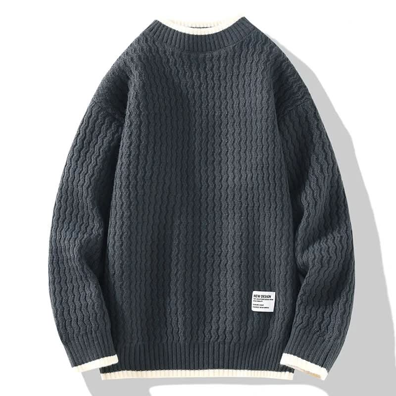 Deze trui is gemaakt van een hoogwaardige wolmix met een dubbelpolige stof en is iets dikker dan onze reguliere truien, wat zorgt voor een natuurlijk ademend en warm silhouet. De kabelgebreide textuur en tweekleurige accentbies langs de kraag, manchetten en zoom accentueren de gestructureerde vorm.